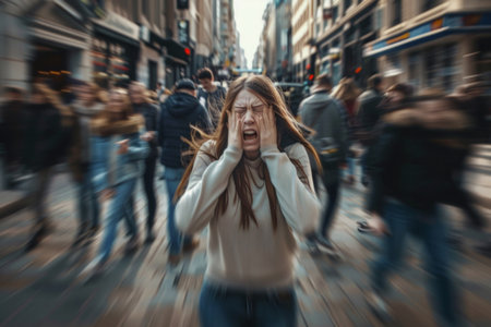 Young woman experiencing panic attack in crowded city street, surrounded by passersby. AI generative