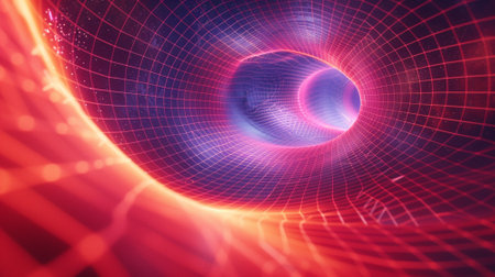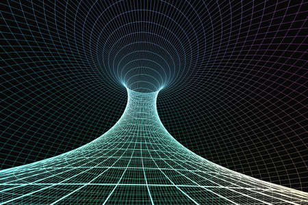 A spiraling tunnel with a central black hole, surrounded by luminous lines and spheres