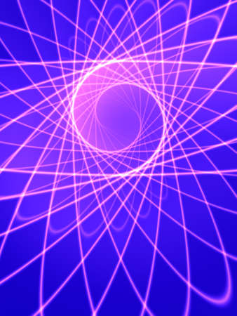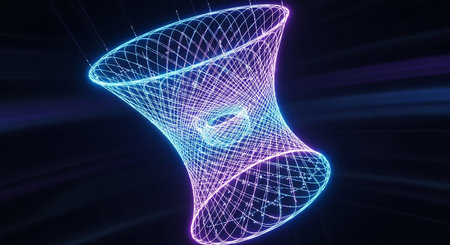 A glowing blue and purple wireframe funnel shape descends into a dark background, creating an abstract and futuristic visual that could symbolize data processing, scientific principles, or a black ho.