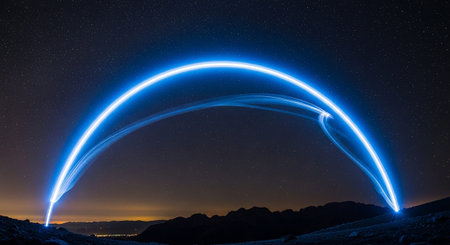 Stunning long exposure photograph capturing beautiful light trails against a tranquil landscape at dusk, creating mesmerizing patterns in the serene evening sky.