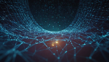 3d rendering of abstract digital wireframe tunnel with glowing particles.