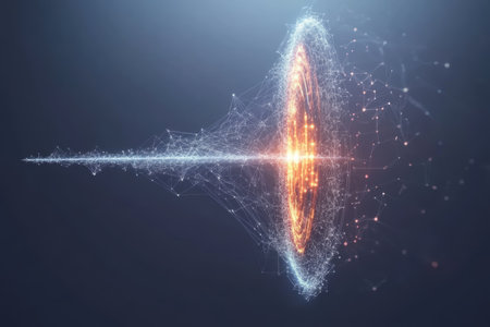 This abstract image features a luminous vortex created by swirling light particles, evoking a sense of dynamic movement and technological depth.