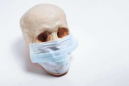 Skull in a medical mask on a white background. The concept of an epidemic, an unknown virus , or a biological weapon.