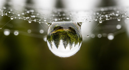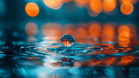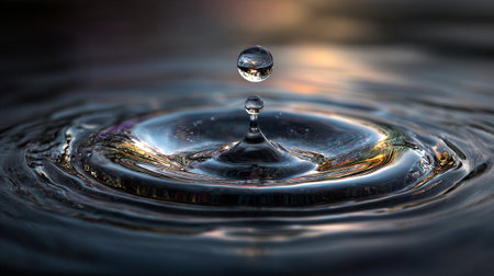 A water droplet impacts a dark blue surface, creating ripples and reflecting light in a serene setting.