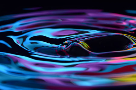 A close-up macro shot captures a single water droplet creating colorful, iridescent ripples on a liquid surface, with small bubbles forming around the edges. Clear details and vibrant colors enh...