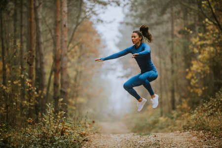 Young woman in blue track suit taking high jump on the forest trail at autumn