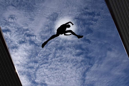 A man jumps over a pit, bottom view. Overcoming difficulties on the way concept