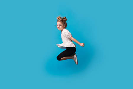 Young girl with eyeglasses and blonde hair jumping on a blue studio wall