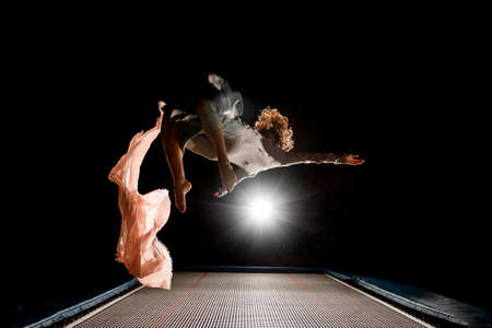Woman trampoline jump young style jumper fashion happy hair female fun joy