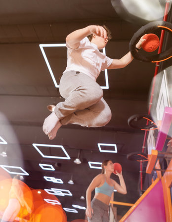 Encouraged young guy in active wear throwing ball in basketball basket while jumping on trampolines in entertainment center