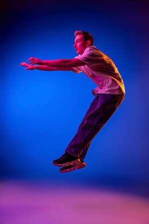 Full-length portrait of young man in casual cloth jumping, posing isolated over blue background in pink neon light