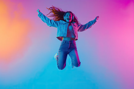 9 year old Latino boy jumps with excitement and happiness while using his headphones to listen to music
