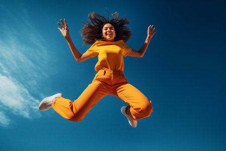 Beautiful woman jumps high up. She flies swiftly against the sky, joyful and happy.