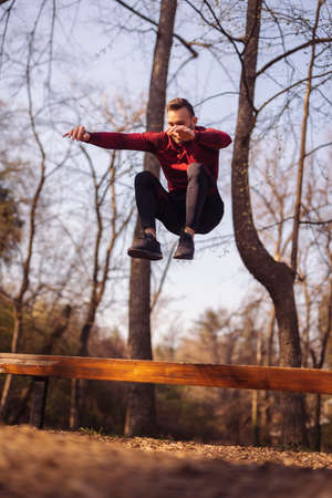 Caucasian man in hoodie jumping high with hands on knees outdoors.
