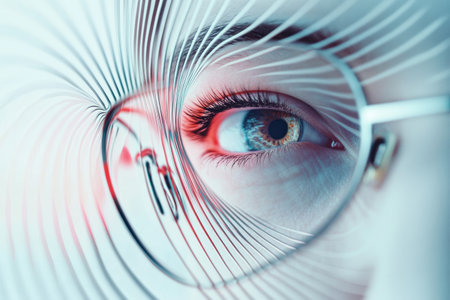 Detailed close up showing a human eye wearing glasses with blue iris and unique spiral patterns in the background for artistic effect.