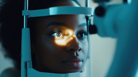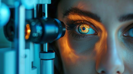 A doctor uses a slit lamp to check a patient's eye health as the light reflects vividly