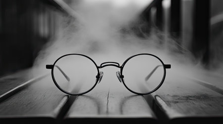 A stunning black and white image featuring round glasses resting on a wooden surface, enveloped in soft fog, creating a mysterious and artistic atmosphere.