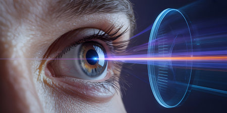 A close-up of a blue iris illuminated by a precise red laser beam, capturing the essence of advanced retinal analysis within a cutting-edge diagnostic environment.