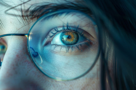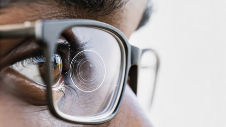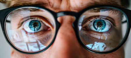 A closeup shot of a person wearing glasses with a reflection of another person in the lenses, showcasing the importance of vision care and eye glass accessories AIG50