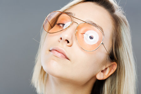 Close up portrait of a Caucasian female checking eyesight in an ophthalmologist clinic