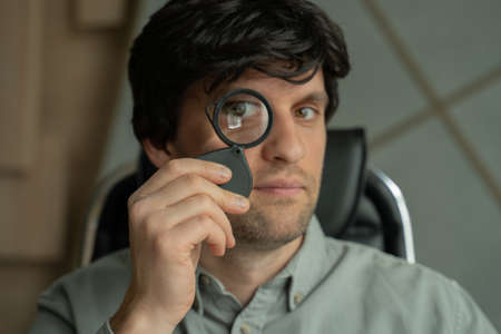Man see through magnifying glass. Male taking a magnifying glass and looking through it