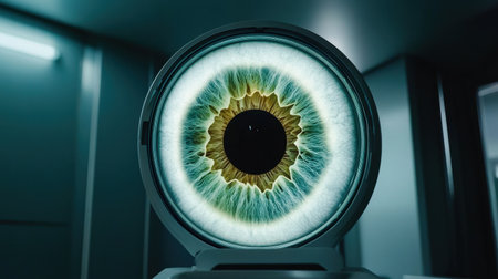 Digital eye scan concept: futuristic biometric technology highlighting iris recognition in a medical setting