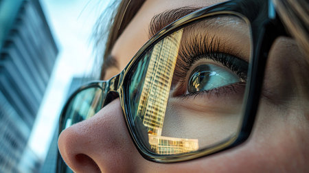 Close-up shot of a womans eye reflecting a cityscape in the background