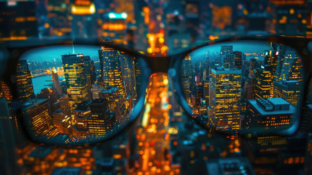 A mesmerizing night cityscape captured in the reflection of glasses. Experience the urban brilliance through a unique eyewear perspective