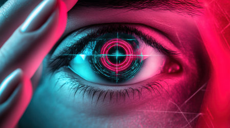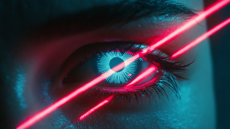 Extreme close-up of human eye scanning with laser technology, representing biometric identification, cybersecurity, digital vision, and futuristic innovation.