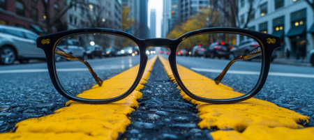 Urban street perspective with stylish glasses positioned on the pavement at ground level