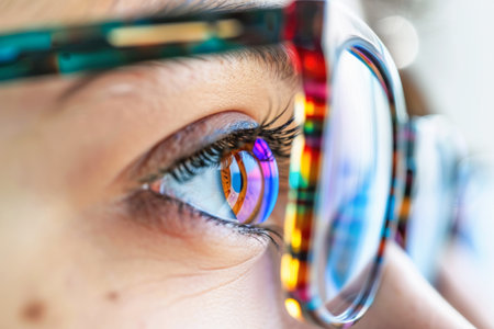 A close up view of a females eye, surrounded by stylish glasses, showing clear vision and detailed reflection seen indoors.