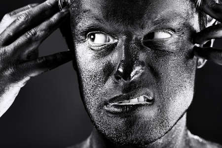 Portrait of expressive man painted with black color. Body painting project.