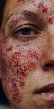 Close-up of a man's face, highlighting vitiligo patches on his skin, with visible texture and details. The man's expression is calm, showcasing unique pigmentation variation