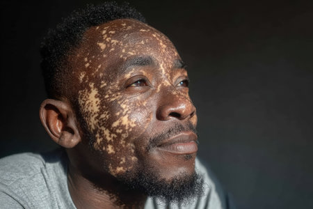 Man with a distinctive skin condition is gazing thoughtfully in soft natural light, showing his features and expression in a serene atmosphere.