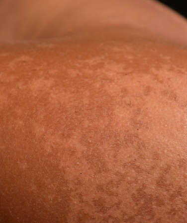 Detail shot of female body focus on skin texture and acne scars on back and shoulders
