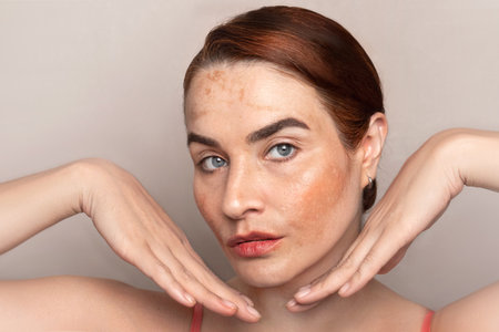 Beautiful woman face with pigmentation, melasma, freckles, age spots