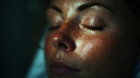 Close-up of a woman's face with closed eyes in a dark room