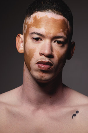 Portrait of young casual woman with vitiligo condition looking at camera close up