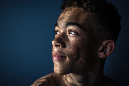 Magazine-style headshot of a teen boy with vitiligo and active acne, illuminated by soft key light. His confident expression and strong posture celebrate individuality and uniqueness.