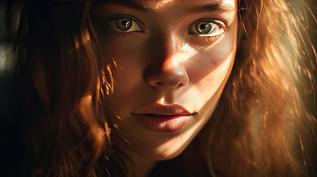 illuminated attractive woman's face stands out from a crowd of anonymous people in the shadows