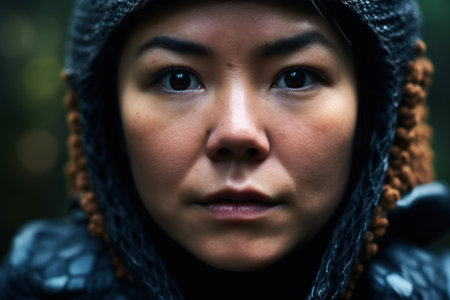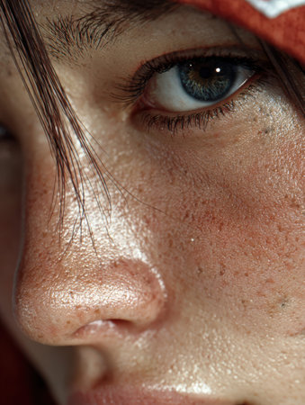 Young woman with blue eyes and wet skin, wearing a red hoodie, showcases intense emotion and determination in a close-up portrait with dramatic lighting