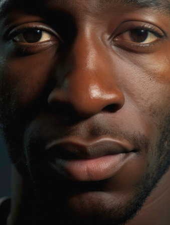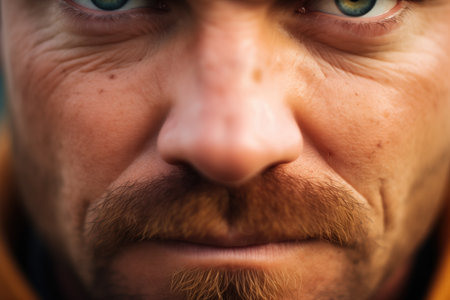 A detailed closeup shot capturing a mans mouth with a stylish beard, emphasizing his jaw, chin, and lips. His eyebrow, nose, and neck are partially shown, creating a mysterious facial gesture