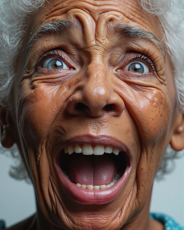 Elderly woman with wrinkled skin, white hair, and blue eyes, displaying a shocked expression with an open mouth and visible teeth.