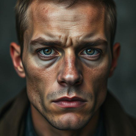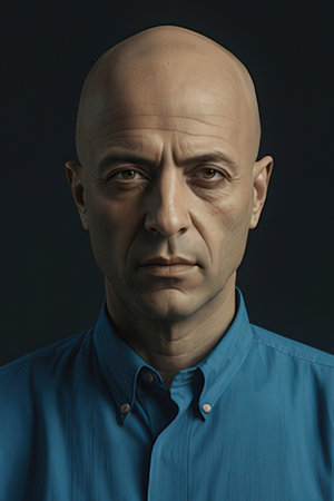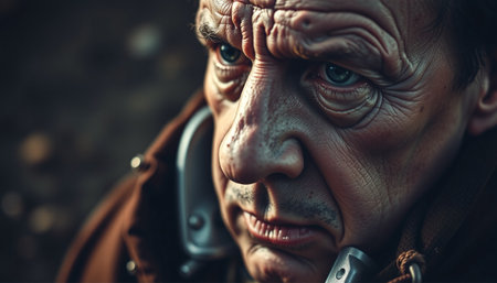 Realistic cinematic portrait, half-body side view, harsh shadows across the face, dark minimal background