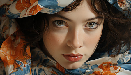 Beautiful young woman exudes confidence and femininity in floral fashion generated by artificial intelligence