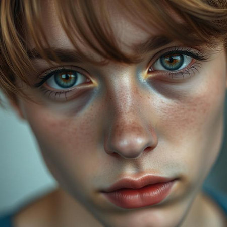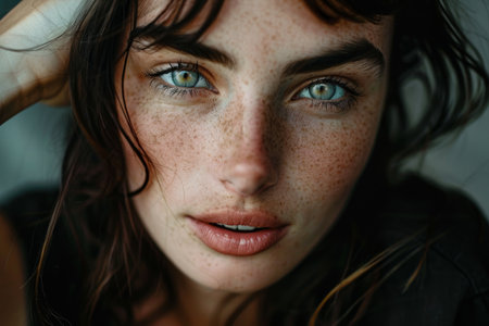 Portrait of a woman with freckles, blue eyes, and natural hair, A portrait of a person with piercing eyes and a subtle smile