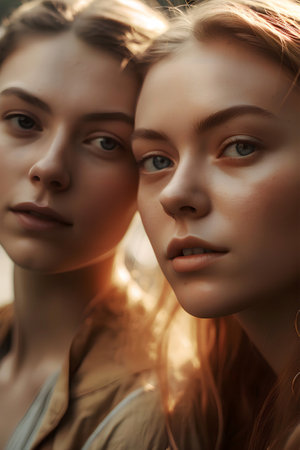Natural Portrait of two blonde women, close-up, natural soft lighting, ai generated art