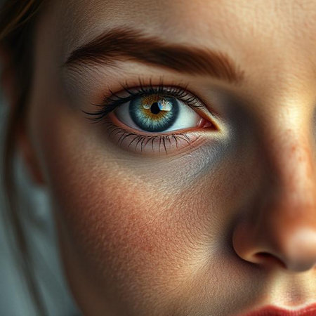 Closeup macro image of a human eye with intricate details of the iris and eyelashes, showcasing beauty and anatomy