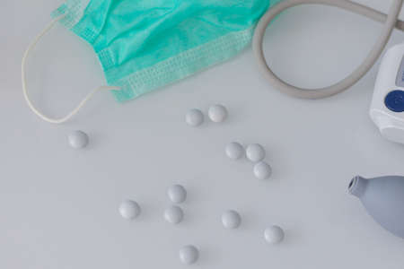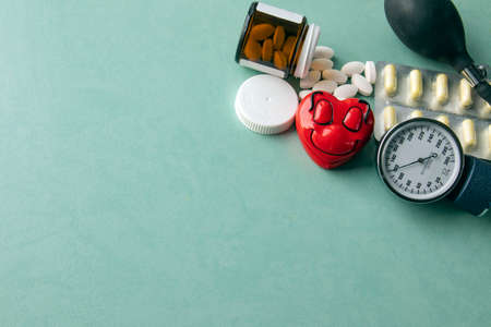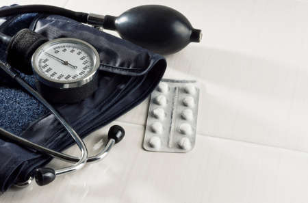 Pills and blood pressure meter on the table. Medical concept. Copy space