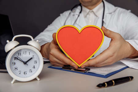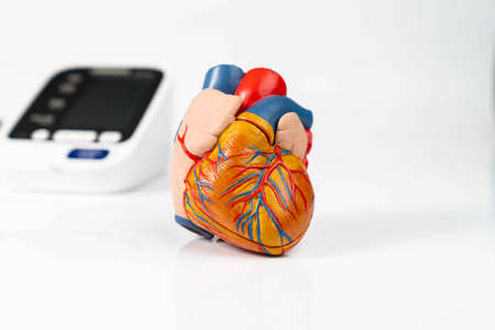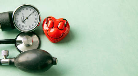 red heart made of stone, stethoscope, pressure meter on a white background on the table